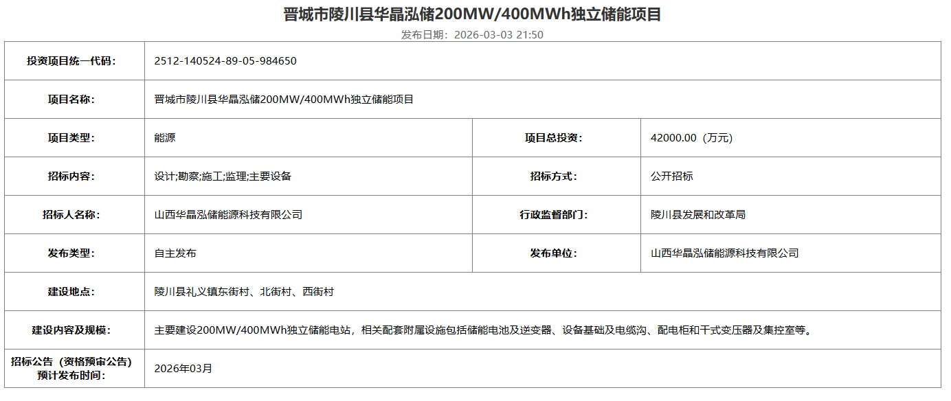 据公告,项目总投资42000万元,单价约合1.05元/Wh。项目建设地点为山西省晋城市陵川县礼义镇东街村、北街村、西街村。招标公告预计发布时间2026年03月。