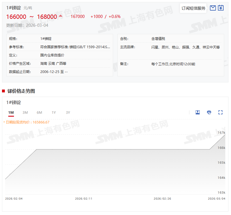 3月4日,SMM1#锑锭的价格为166000~168000元/吨,其均价为167000元/吨,较前一交易日涨0.6%。