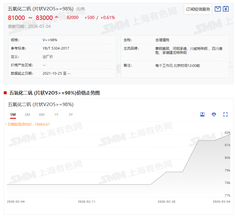 现货市场供需紧平衡以及下游需求向好等带动钒价近期出现上涨。五氧化二钒 (片状V2O5>=98%)3月4日价格出现上涨,其均价较前一交易日涨0.61%。