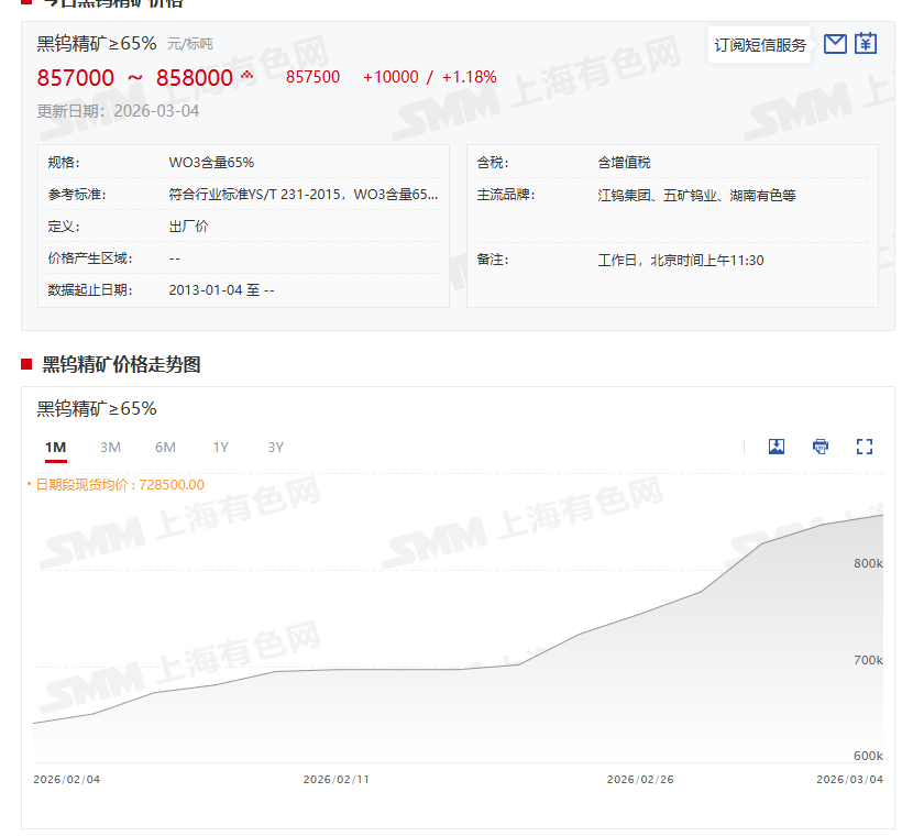 钨价近来持续攀升,迭创历史新高。3月4日,黑钨精矿(≥65%)价格为857000~858000元/标吨,其均价的历史新高也刷新至857500元/标吨!而857500元/标吨这一均价新高与2025年12月31日的均价453500元/标吨相比,其均价今年以来上涨了404000元/标吨,其均价今年以来的涨幅为89.08%。而857500元/标吨这一均价与2024年12月31日的均价142750元/标吨相比,一年多以来更是上涨了714750元/标吨,一年多以来的涨幅高达500.7%!