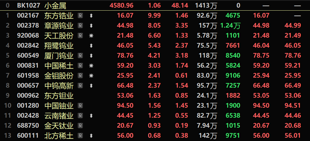 3月4日,国内锑、钨、钒、钽、铌等小金属现货价格上行,小金属板块逆势上涨。截至4日收盘,小金属涨幅达1.06%,个股方面:东方锆业涨停,章源钨业、天工股份、翔鹭钨业、厦门钨业、中国稀土等涨幅居前。