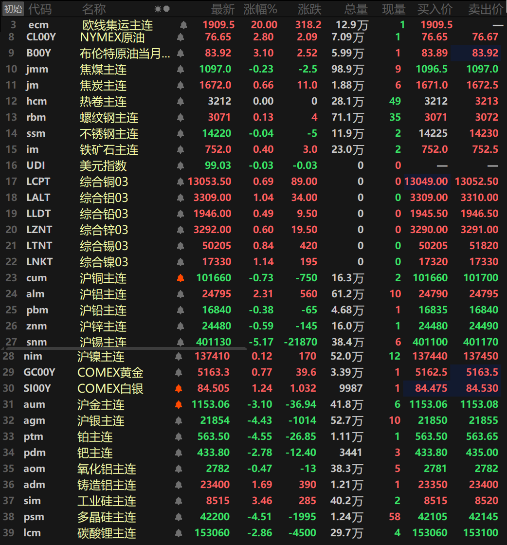 此外,碳酸锂跌2.86%,工业硅涨3.46%,多晶硅跌4.51%。欧线集运主连以20%的涨幅封死涨停板,报1909.5。
