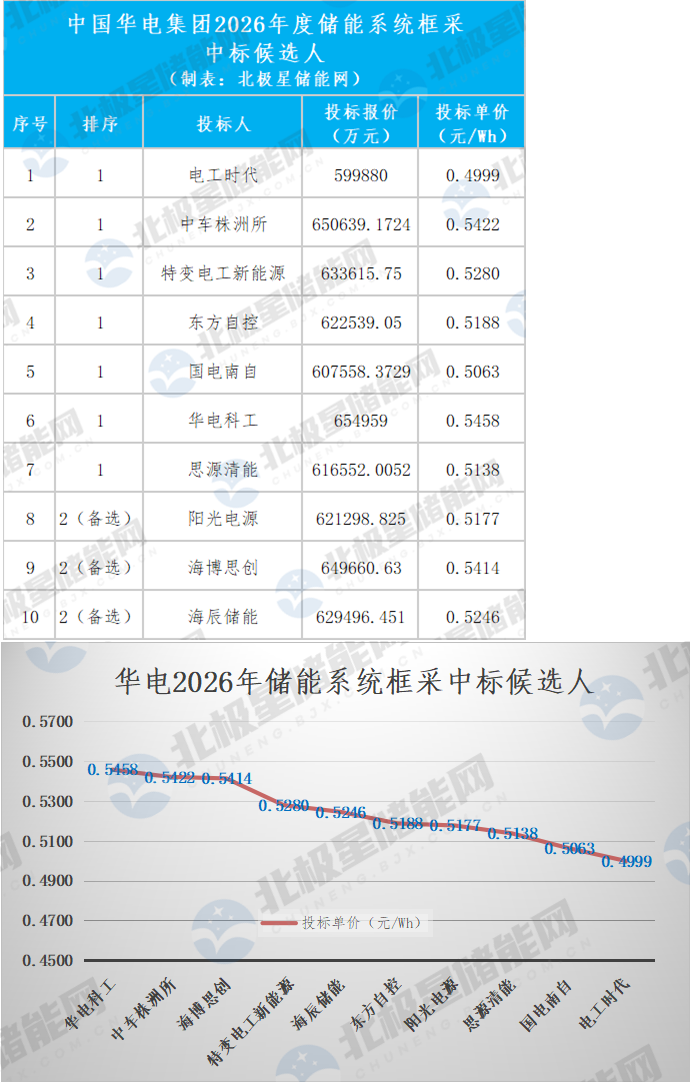 北极星储能网获悉,3月3日,中国华电集团2026年储能系统框采中标候选人公示,共有10家企业入围,整体报价范围为0.4999~0.5458元/Wh,整体平均价格0.5238元/Wh。按中标排序依次为:电工时代、中车株洲所、特变电工新能源、东方自控、国电南自、华电科工、思源清能、阳光电源、海博思创、海辰储能。其中前7家企业为中标,后三家为备选。