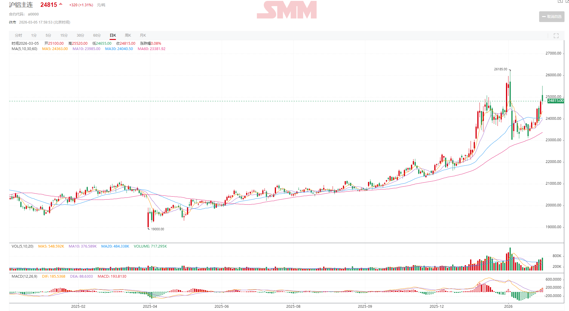 今日早间开盘,沪铝也跟随外盘跳空高开,盘中一度涨逾4%,不过临近收盘涨幅有所收窄,截至日间收盘,沪铝主连以1.31%的涨幅报24815元/吨,较2月27日收盘的23835元/吨上涨980元/吨,涨幅达4.11%。