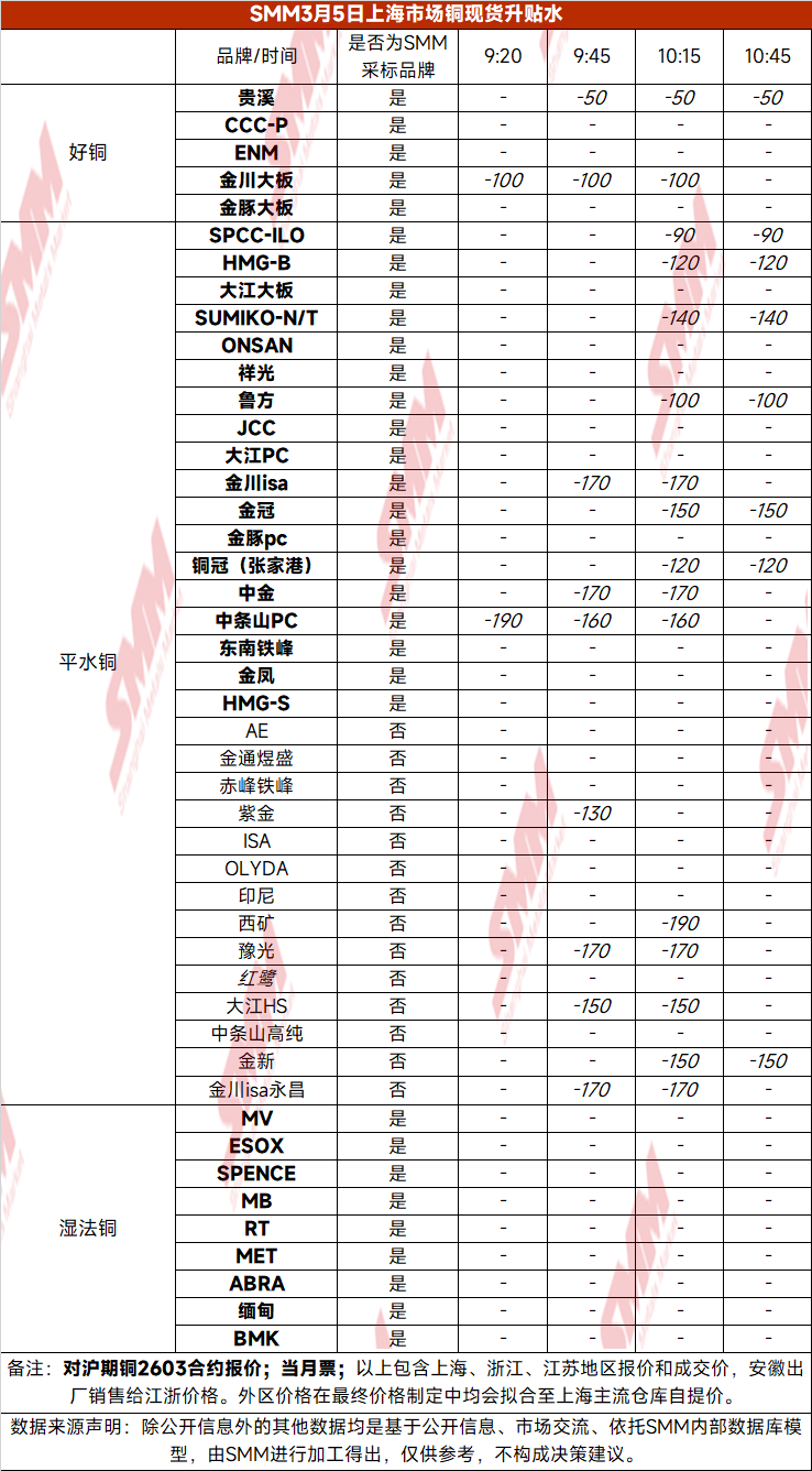 3月5日上海市场铜现货升贴水(第四时段)【SMM价格】