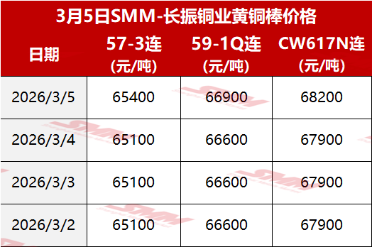 【SMM价格】2026年3月5日长振黄铜棒价格