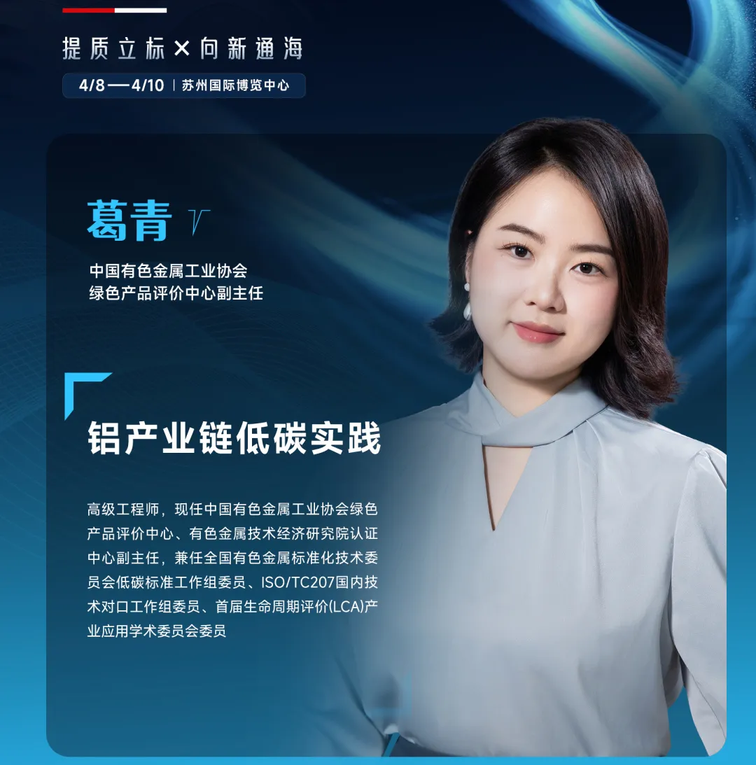 SMM AICE(第二十一届)铝业大会暨铝产业博览会将于2026年4月8-10日,在苏州国际博览中心盛大启幕,特邀中国有色金属工业协会,绿色产品评价中心副主任葛青,带来《铝产业链低碳实践》专题论坛。