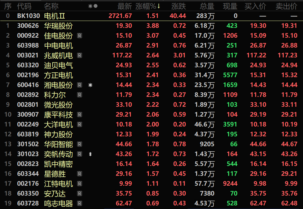 全国两会召开,《政府工作报告》聚焦新质生产力、高端装备、智能制造等,电机作为工业自动化、机器人、新能源车核心部件,直接受益政策支持;AI 大模型爆发推高数据中心用电,倒逼电网扩容、电力设备升级,高压电机、特种电机、高效电机需求激增;湖南省、青海省、河南省、福建省、江西省等多地陆续出台汽车以旧换新配套细则,新能源车报废补贴等刺激整车销量,传导至电机零部件需求;美伊冲突持续,部分资金偏好能源安全、电力自主相关板块,电机属电力设备链具备一定的防御和成长属性等利好消息,带动电机板块走强。截至3月5日收盘,电机行业涨1.51%,个股方面:华瑞股份涨3.88%,佳电股份、中电电机、兆威机电、迪贝电气、科力尔、方正电机以及湘电股份等涨幅居前。