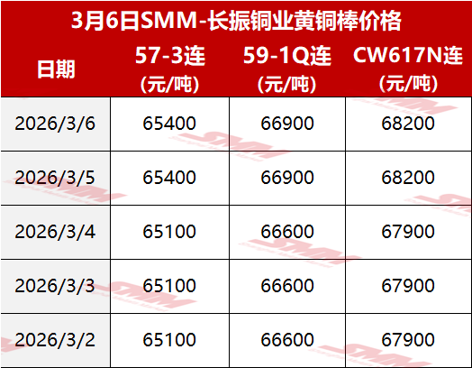 【SMM价格】2026年3月6日长振黄铜棒价格