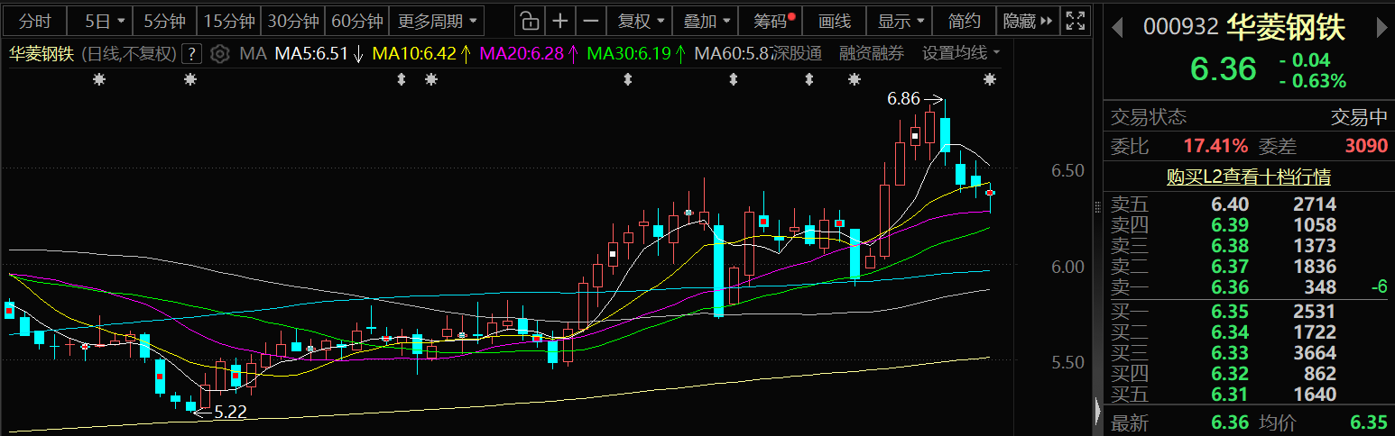 3月5日,华菱钢铁股价出现下跌,截至5日11:17分,华菱钢铁跌0.63%,报6.36元/股。