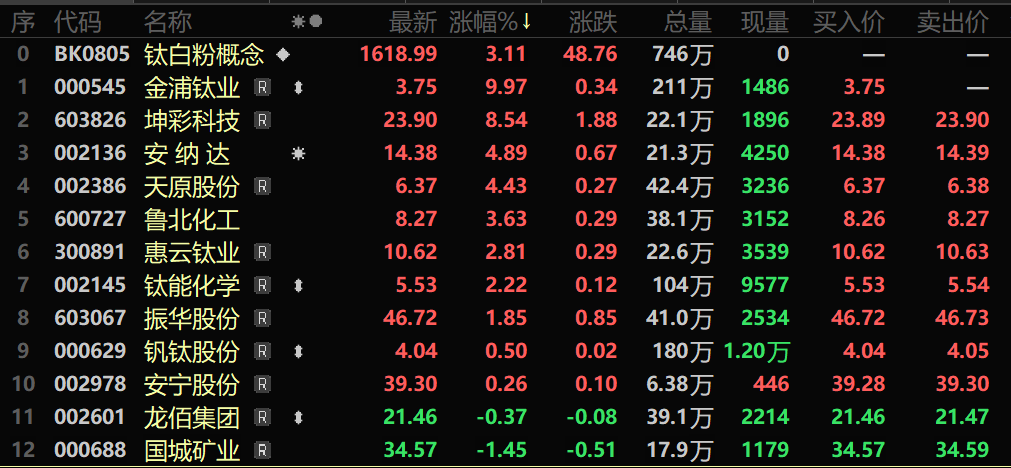 在成本支撑、需求回暖、供应收紧的多重利好共振下,2月下旬至3月初,陆续有钛白粉企业发布调价函,带动A股钛白粉概念出现上涨。据悉,节后行业涨价呈现“分层推进、全面蔓延”态势,先由氯化法企业率先发起调价,随后硫酸法企业密集跟涨,行业报价集体上行,市场信心有所提振。叠加部分市场资金青睐涨价逻辑的板块,也推动了钛白粉概念走强,截至3月6日收盘,钛白粉概念涨3.11%,个股方面:金浦钛业涨停,坤彩科技、安纳达、天原股份以及鲁北化工等涨幅居前。