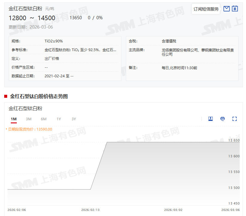 从具体报价来看,据SMM报价显示,3月6日,SMM金红石型钛白粉报价为12800~14500 元/吨,其均价报13650元/吨,与前一交易日持平。与2025年12月31日的均价13500元/吨相比,今年以来上涨了150元/吨,涨幅为1.11%。