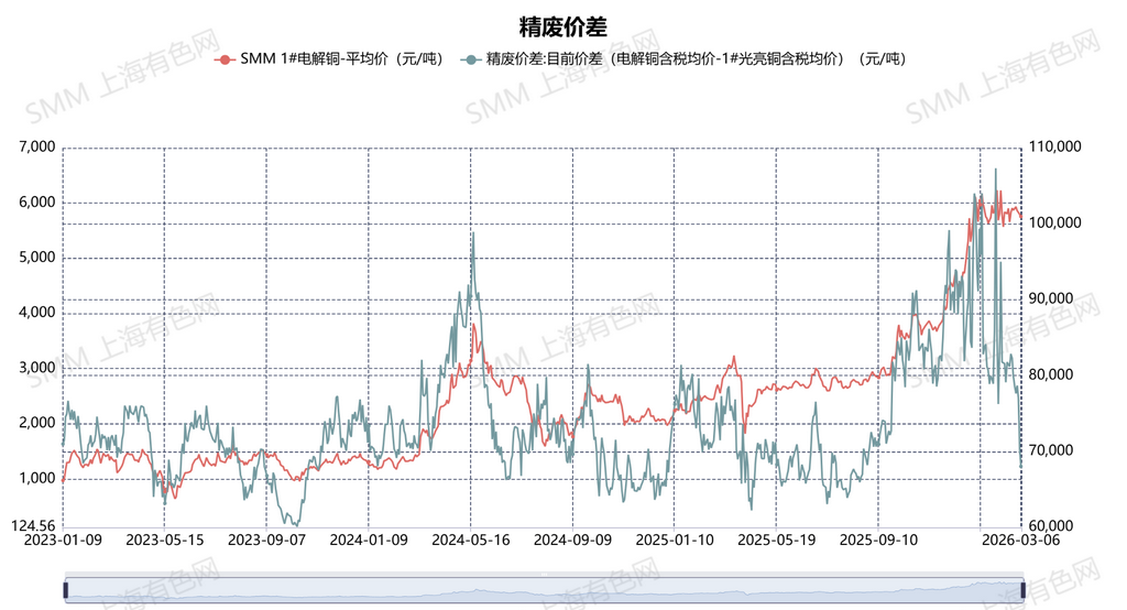 本周铜价震荡下行,降幅1560元/吨,广东光亮铜价格90700-90900元/吨,降幅500元/吨。再生铜原料表现出亮眼的抗跌性,是随着利废企业本周普遍恢复采购,其需求明确指向含税再生铜原料,导致票点从年前的9.1%-9.3%快速攀升至10.0%-10.2%。票点的急剧上涨直接推高了含税再生铜原料的实际采购成本,使得精废价差在3月5日大幅收窄939元/吨至1535元/吨,精废杆价差也收缩至180元/吨的极低水平。这一变化意味着,尽管绝对铜价下行,但含税原料的成本抬升严重侵蚀了再生铜杆的经济性优势。纵观全周,市场经历了从“观望僵持”到“价格驱动成交放量”,最终步入“票点攀升压制利润”的阶段。
