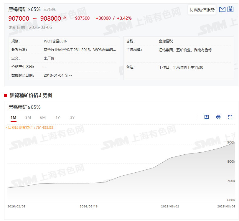 随着钨价持续迭创新高,黑钨精矿均价成功突破90万元/标吨关口,价格涨幅表现亮眼!据SMM报价显示,3月6日,黑钨精矿(≥65%)价格为907000~908000元/标吨,其均价报907500元/标吨,较前一交易日上涨3.42%。而907500元/标吨这一均价与2025年12月31日的均价453500元/标吨相比,其均价今年以来上涨了454000元/标吨,其均价今年以来的涨幅为100.11%。值得一提的是,907500元/标吨这一均价与其2024年12月31日的均价142750元/标吨相比,一年多以来更是上涨了764750元/标吨,一年多以来的涨幅高达535.73%,凸显钨市场的强势上行态势!