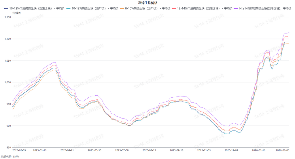 SMM10-12%高镍生铁均价较上周上升21.1元/镍点至1092.6元/镍点(出厂含税),印尼NPIFOB指数价格均价较上周上升2.22美金/镍点录得138.54美金/镍点。节日氛围逐渐消散,下游钢厂陆续复工,高镍生铁成交量逐渐增加。