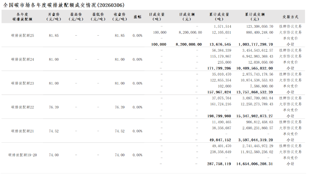 截至2026年3月6日,全国碳市场碳排放配额累计成交量879,848,826吨,累计成交额58,770,184,263.87元。
