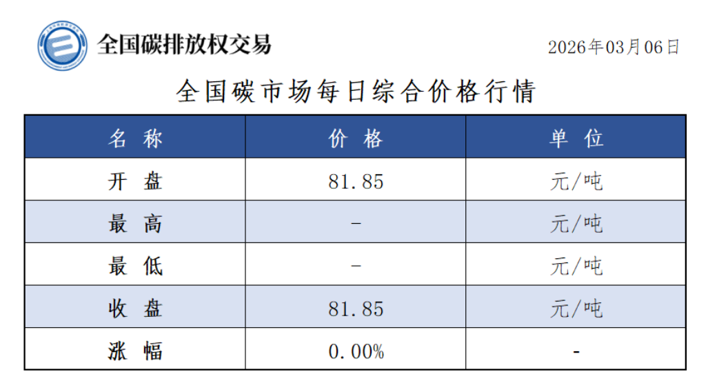 今日全国碳市场综合价格行情为: 开盘价81.85元/吨,收盘价81.85元/吨,收盘价与前一日持平。