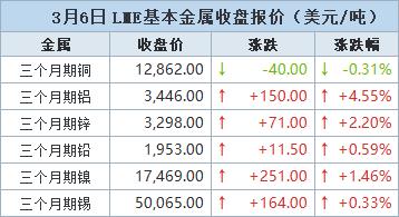 伦敦时间3月6日17:00(北京时间3月7日01:00),LME三个月期铝上涨150美元,或4.55%,收报每吨3,446美元。