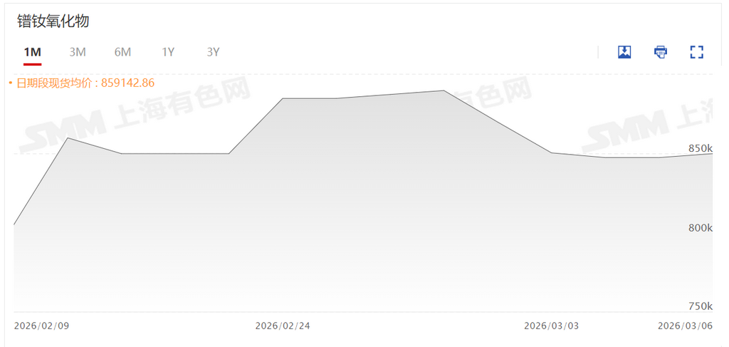 SMM3月8日讯:本周国内稀土氧化物市场呈现整体价格回调态势,多数主流产品成交价较前期有明显回落。这一走势主要受短期消息面因素影响,市场此前积聚的看涨情绪受到明显抑制,部分贸易商信心有所松动,主动降价出货意愿增强,导致现货市场实际成交价格逐步下探。
