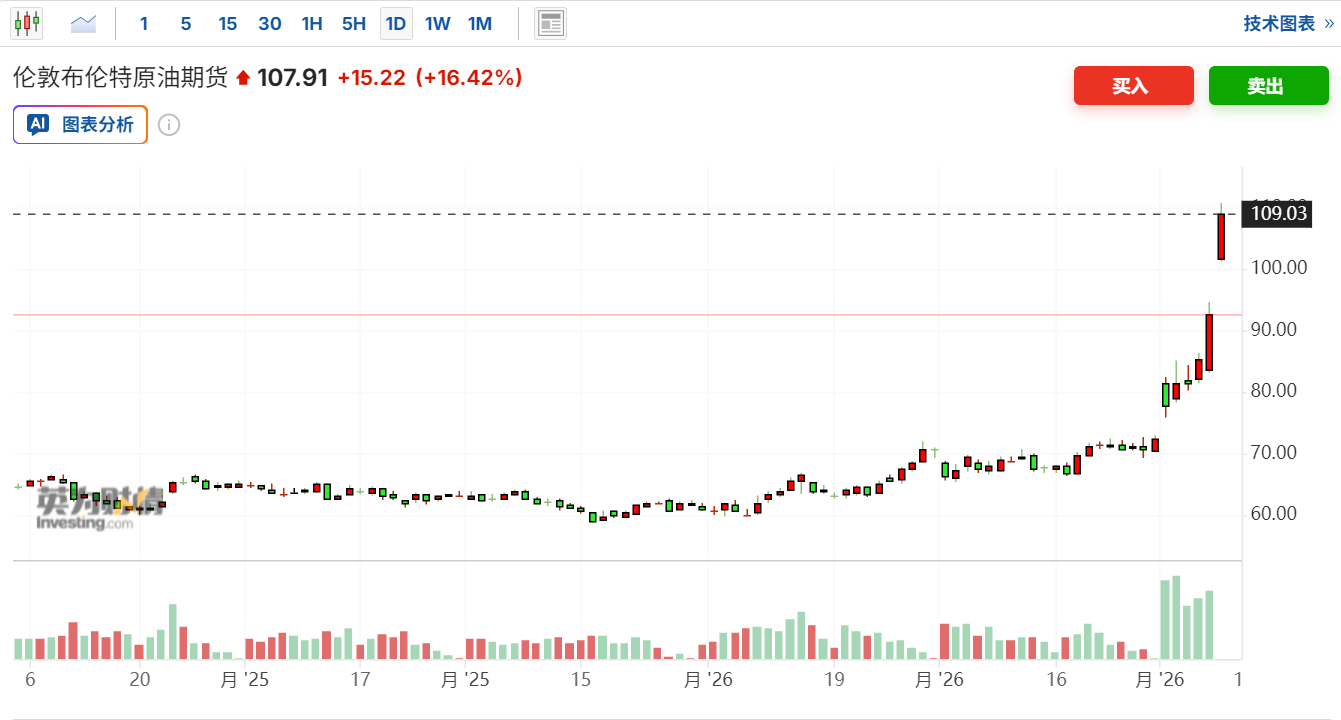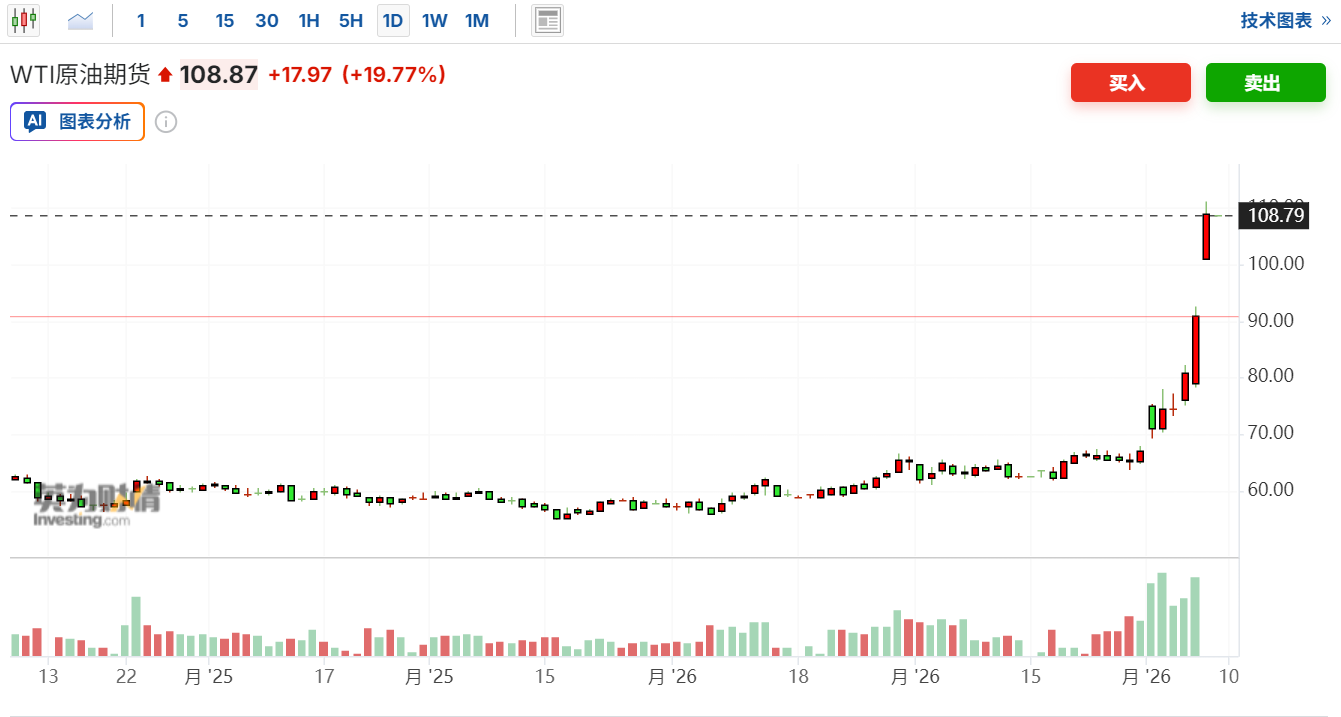 受冲突升级影响,中东地区石油运输持续受阻,伊拉克、卡塔尔等主要产油国此前已宣布减产,国际油价涨幅持续扩大。WTI原油期货向上触及110美元/桶,最新报111.0美元/桶,日内上涨22.11%。布伦特原油期货向上触及110美元/桶,最新报110.263美元/桶,日内上涨18.96%。(财联社)