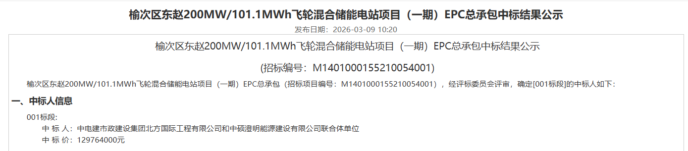 北极星储能网获悉,3月9日,山西榆次区东赵200MW/101.1MWh飞轮混合储能电站项目(一期)EPC总承包中标结果公示,中标人为中电建市政建设集团北方国际工程有限公司和中硕澄明能源建设有限公司联合体单位,中标价为129764000元,约合单价1.3元/Wh。