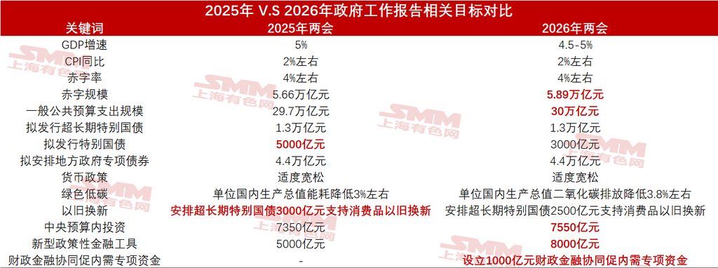 十四届全国人大四次会议5日上午9时在人民大会堂开幕,国务院总理李强作政府工作报告。SMM根据政府工作报告相关内容,对部分核心关键词的表述,与2025年进行了对比: