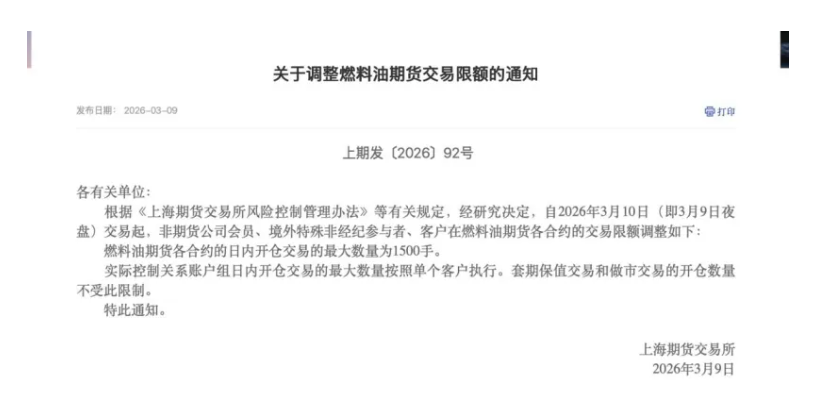 至于燃料油期货,上期所同样调整其日内开仓交易数量及交易手续费。自2026年3月10日(即3月9日夜盘)交易起,非期货公司会员、境外特殊非经纪参与者、客户在燃料油期货各合约的日内开仓交易的最大数量为1500手。同时,实际控制关系账户组日内开仓交易的最大数量按照单个客户执行。套期保值交易和做市交易的开仓数量不受此限制。