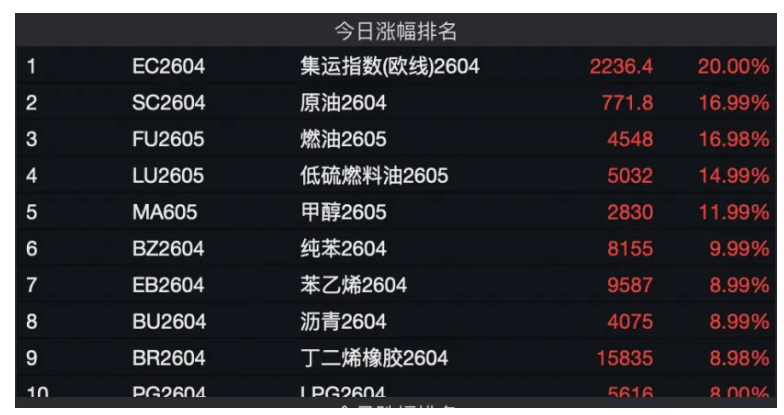 3月9日,受中东冲突不断升级、霍尔木兹海峡通行受阻、部分中东主要产油国被迫削减供应等影响,WTI油价盘中一度涨超31%,创下2022年中期以来最高水平。受此带动,国内能化期货板块掀起涨停潮。截至当日收盘,原油、燃料油、低硫燃料油、石油沥青及丁二烯橡胶等上期所能化系一线期货主力合约集体涨停。此外,集运指数(欧线)期货主力合约也同步涨停。