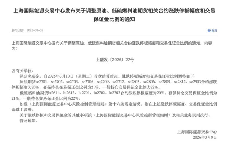 与此同时,上期能源同步调整原油、低硫燃料油期货相关合约涨跌停板幅度和交易保证金比例。自2026年3月10日(星期二)收盘结算时起,sc2701、sc2702、sc2703、sc2706、sc2709、sc2712、sc2803、sc2806、sc2809、sc2812、sc2903合约涨跌停板幅度为20%,套保持仓交易保证金比例为21%,一般持仓交易保证金比例为22%。低硫燃料油期货方面,自2026年3月10日(星期二)收盘结算时起,lu2611、lu2612、lu2701、lu2702、lu2703合约涨跌停板幅度为20%,套保持仓交易保证金比例为21%,一般持仓交易保证金比例为22%。