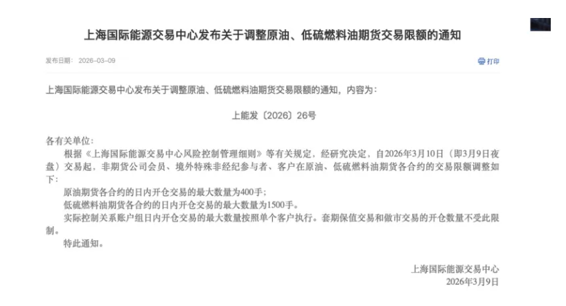 原油期货方面,上期能源公告称,自2026年3月10日(即3月9日夜盘)交易起,非期货公司会员、境外特殊非经纪参与者、客户在原油、低硫燃料油期货各合约的日内开仓交易的最大数量分别为400手及1500手。