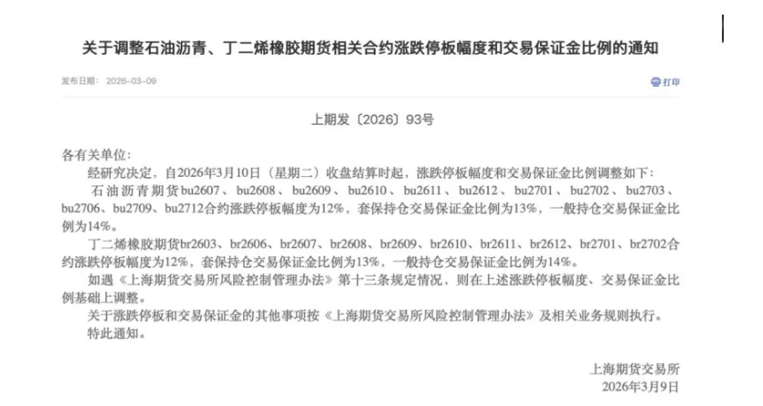 上期所公告显示,石油沥青期货方面,自2026年3月10日(星期二)收盘结算时起,bu2607、bu2608、bu2609、bu2610、bu2611、bu2612、bu2701、bu2702、bu2703、bu2706、bu2709、bu2712合约涨跌停板幅度为12%,套保持仓交易保证金比例为13%,一般持仓交易保证金比例为14%。丁二烯橡胶期货方面,自2026年3月10日(星期二)收盘结算时起,br2603、br2606、br2607、br2608、br2609、br2610、br2611、br2612、br2701、br2702合约涨跌停板幅度为12%,套保持仓交易保证金比例为13%,一般持仓交易保证金比例为14%。