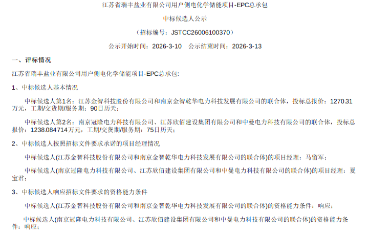 北极星储能网获悉,3月10日,江苏省瑞丰盐业有限公司用户侧电化学储能项目EPC总承包中标候选人公示,第1名为由江苏金智科技股份有限公司与南京金智乾华电力科技发展有限公司组成的联合体,投标总报价为1270.31万元,约合单价0.947元/Wh,承诺工期为90日历天。第2名为由南京冠隆电力科技有限公司、江苏欣佰建设集团有限公司与中曼电力科技有限公司组成的联合体,投标总报价为1238.084714万元,约合单价0.923元/Wh,承诺工期为75日历天。