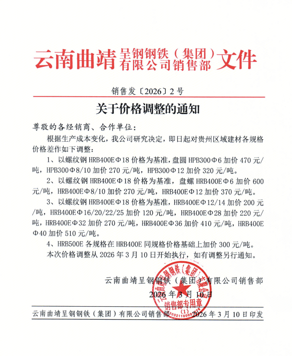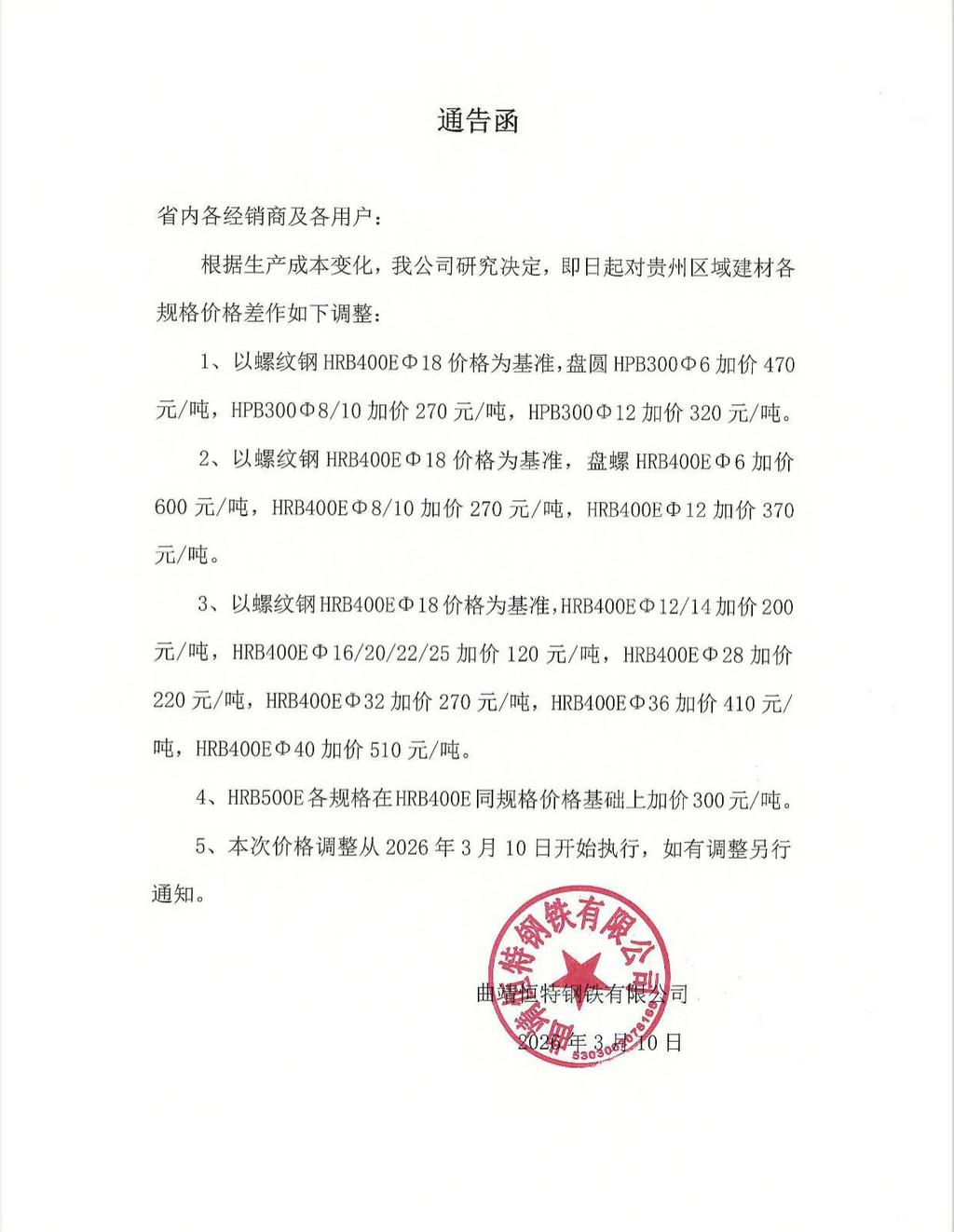 5、本次价格调整从2026年3月10日开始执行,如有调整另行通知。
