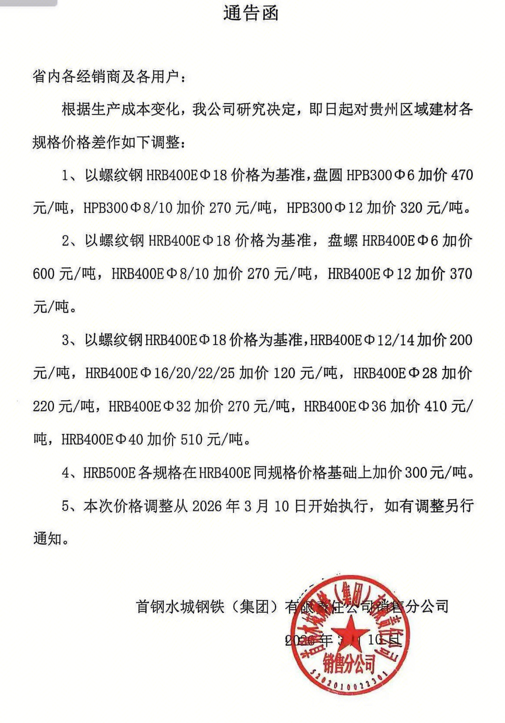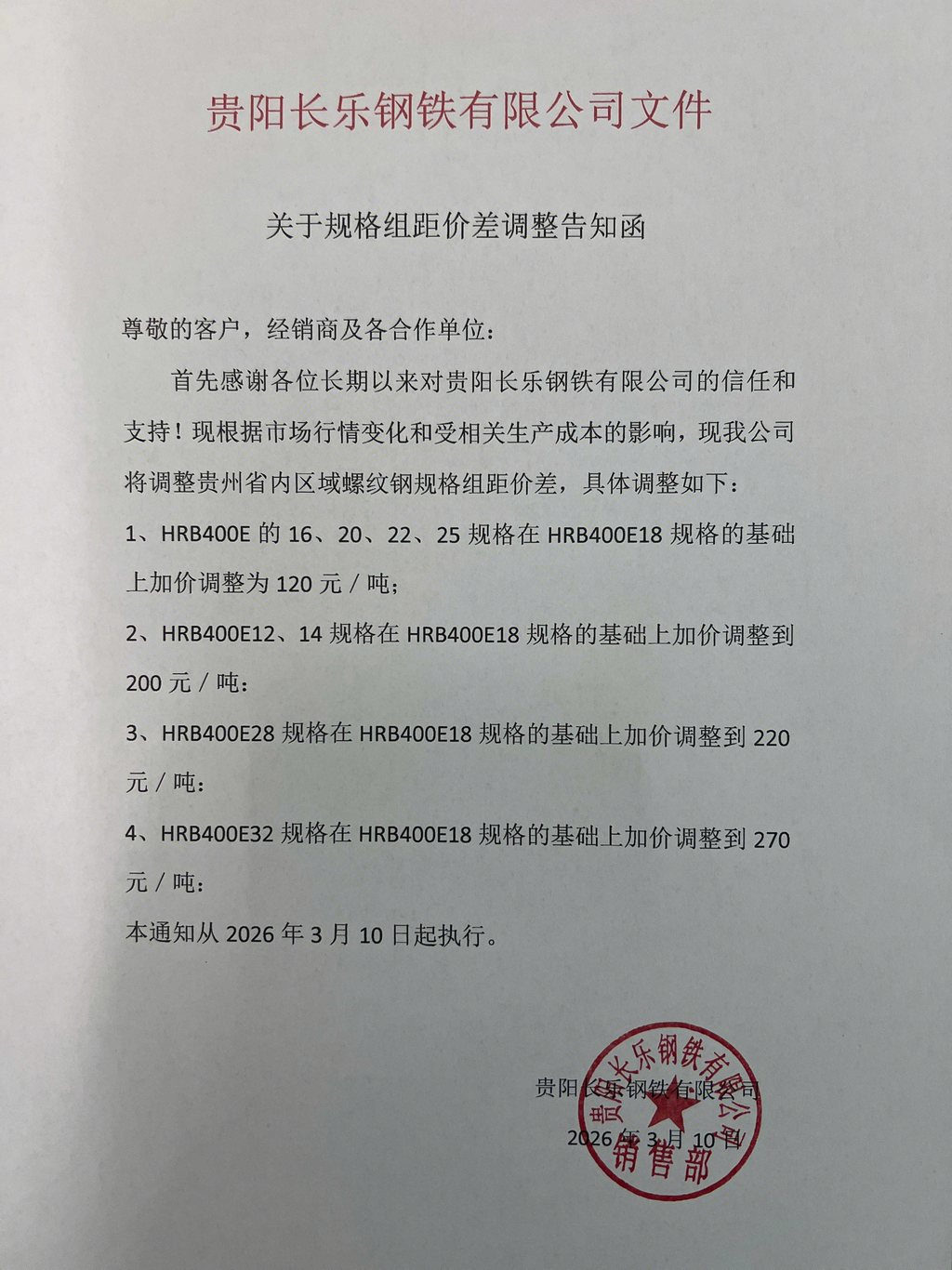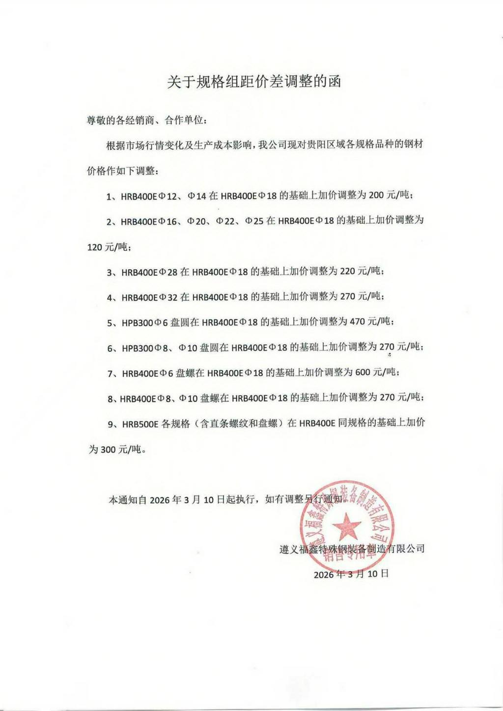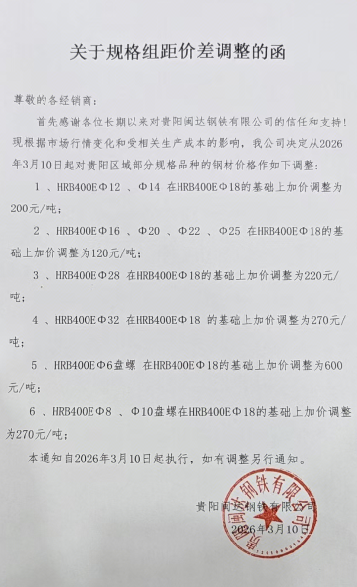 根据当前生产实际情况,结合目前市场需求,3月10日起,水钢、呈钢、恒钢、遵义福鑫、贵阳闽达、贵阳长乐等流通钢厂,对贵阳区域建筑钢材规格组距价差进行如下调整: