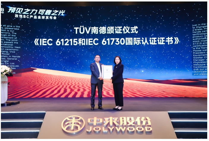 首发仪式后,TÜV南德大中华区智能电力设备及光伏副总裁许海亮上台,为中来改性BC产品颁发IEC 61215与IEC 61730双国际认证证书。两项核心认证的斩获,标志着中来改性BC产品的安全性、可靠性已全面达到国际顶尖标准,不仅获得权威机构的官方背书,更为产品后续进军全球市场筑牢了坚实根基。
