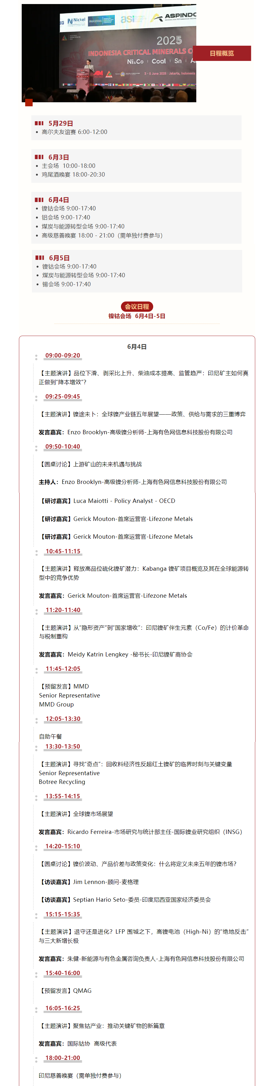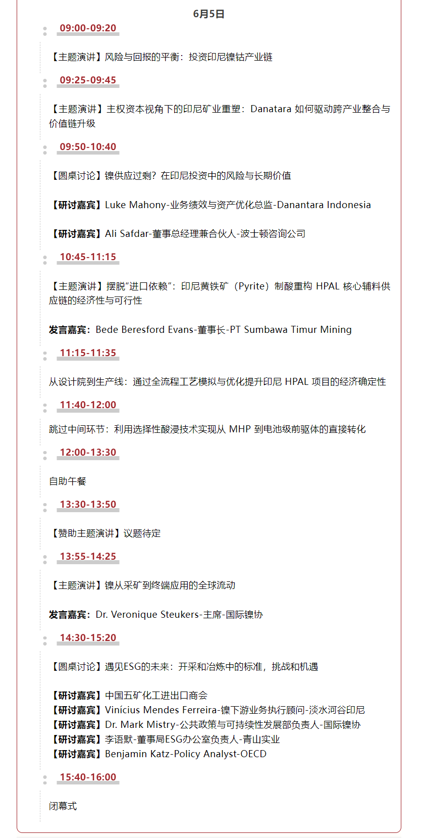 围绕这些关键问题,2026印尼矿业大会将特别设置圆桌论坛——《遇见ESG的未来:开采和冶炼中的标准、挑战和机遇》,本场圆桌论坛将汇聚来自国际组织、矿业企业及行业机构的多位嘉宾,从矿山到冶炼厂的关键环节,共同探讨矿业可持续发展的现实挑战与未来路径。