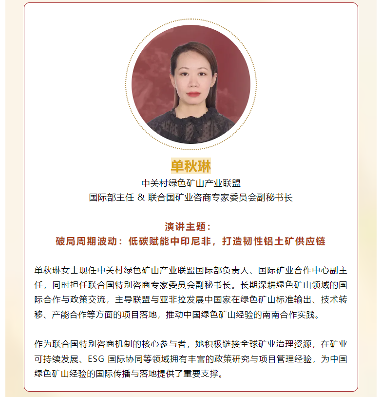 在此背景下,我们特邀中关村绿色矿山产业联盟国际部主任、联合国矿业咨商专家委员会副秘书长 单秋琳,围绕《破局周期波动:低碳赋能中印尼非,打造韧性铝土矿供应链》 这一主题展开分享,探讨低碳转型背景下全球铝土矿供应链的协同与重构。