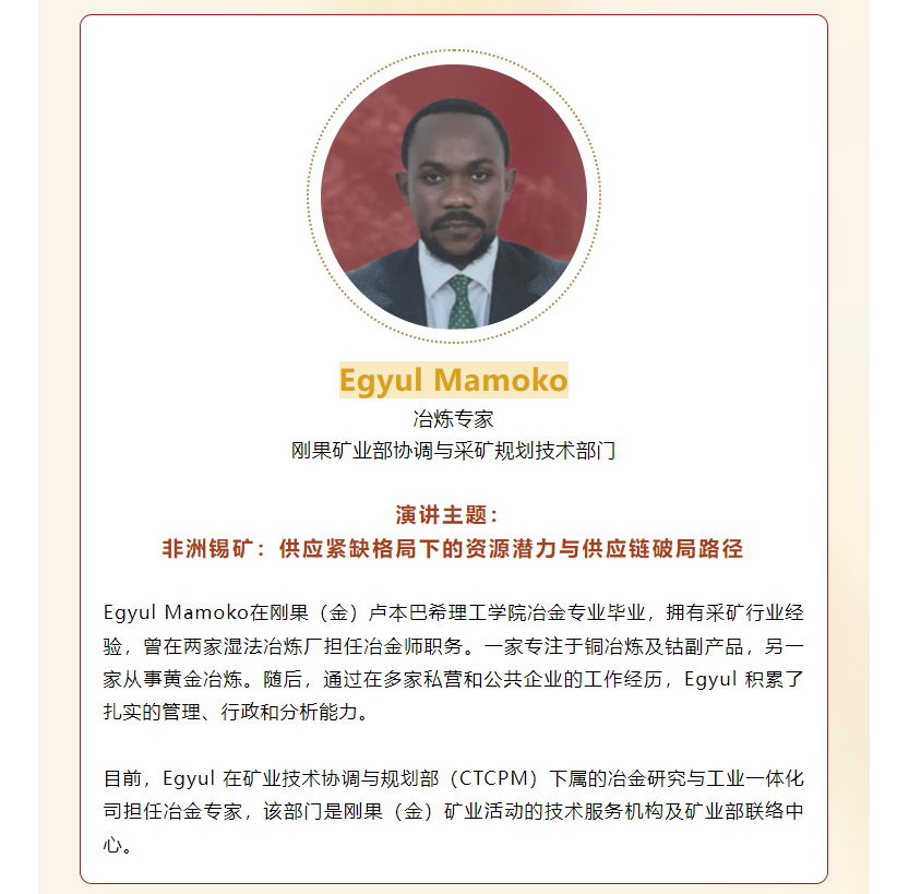 我们特邀刚果矿业部协调与采矿规划技术部门冶炼专家 Egyul Mamoko,围绕 《非洲锡矿:供应紧缺格局下的资源潜力与供应链破局路径》 展开分享。