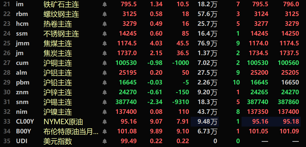 黑色系均飘红,铁矿涨1.34%,螺纹涨0.58%,热卷涨0.49%,不锈钢涨0.6%。双焦方面:焦煤主力合约涨4.03%,焦炭主力合约涨2.15%。