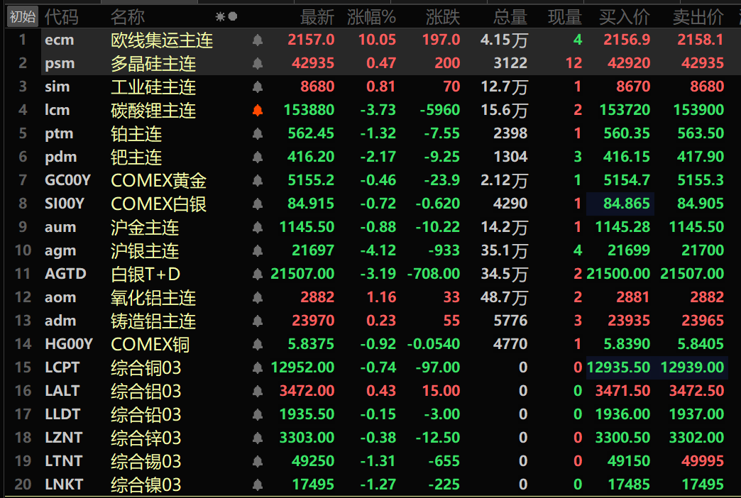 此外,截至午间收盘,铂主连期货跌1.32%,钯主连期货跌2.17%。