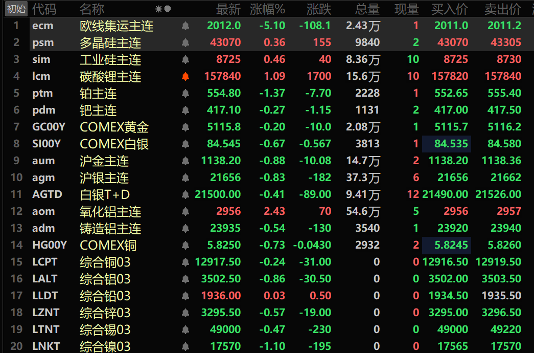 此外,铸造铝主连期货跌0.54%,氧化铝主连涨2.43%。碳酸锂主连涨1.09%。工业硅主连涨0.46%。多晶硅主连涨0.36%。