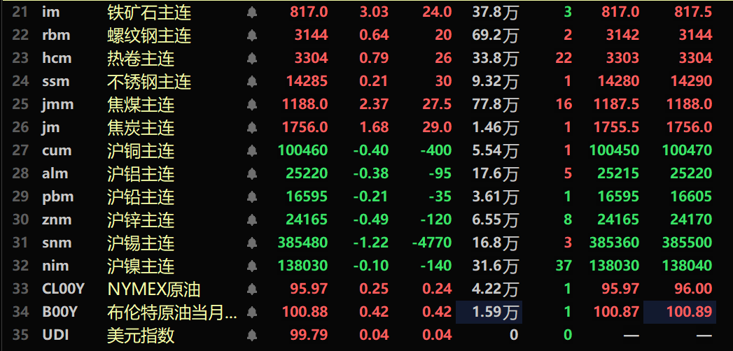 黑色系均飘红,铁矿涨3.03%,螺纹涨0.64%,热卷涨0.79%,不锈钢涨0.21%。双焦方面:焦煤主力合约涨2.37%,焦炭主力合约涨1.68%。