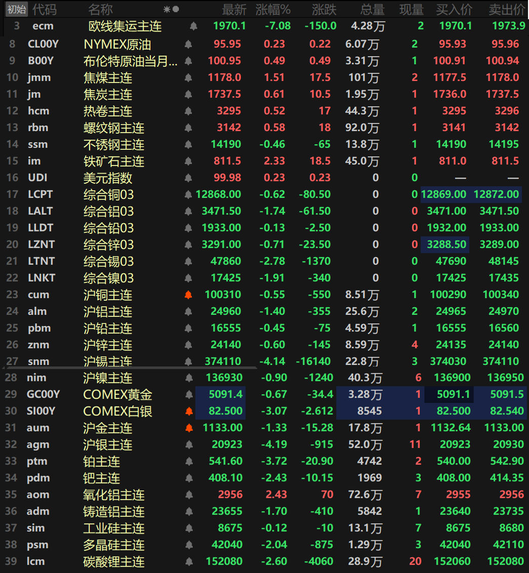 此外,碳酸锂主连跌2.6%,多晶硅主连跌2.04%,工业硅主连跌0.12%。欧线集运主连跌7.08%报1970.1。