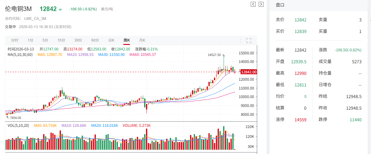 随着中东冲突再度升级,国际油价出现大幅上涨,市场对美国通胀回升的预期重新抬头,美联储降息预期降温等宏观层面的不利因素,共同对铜价形成压制。与此同时,铜库存高企使得铜价承压,但铜精矿供应偏紧的情况,仍从供应端给铜价提供了一定支撑,从而限制了铜价的下跌幅度。截至3月13日16:36分,伦铜跌0.82%,其周线两连跌,当周周线暂时跌0.86%;沪铜主力合约跌0.55%,其周线连跌两周,当周跌0.47%。当前宏观层面不确定性仍存,而基本面上,随着下游消费逐步复苏所带来的去库预期逐步显现,铜价后市将如何表现?