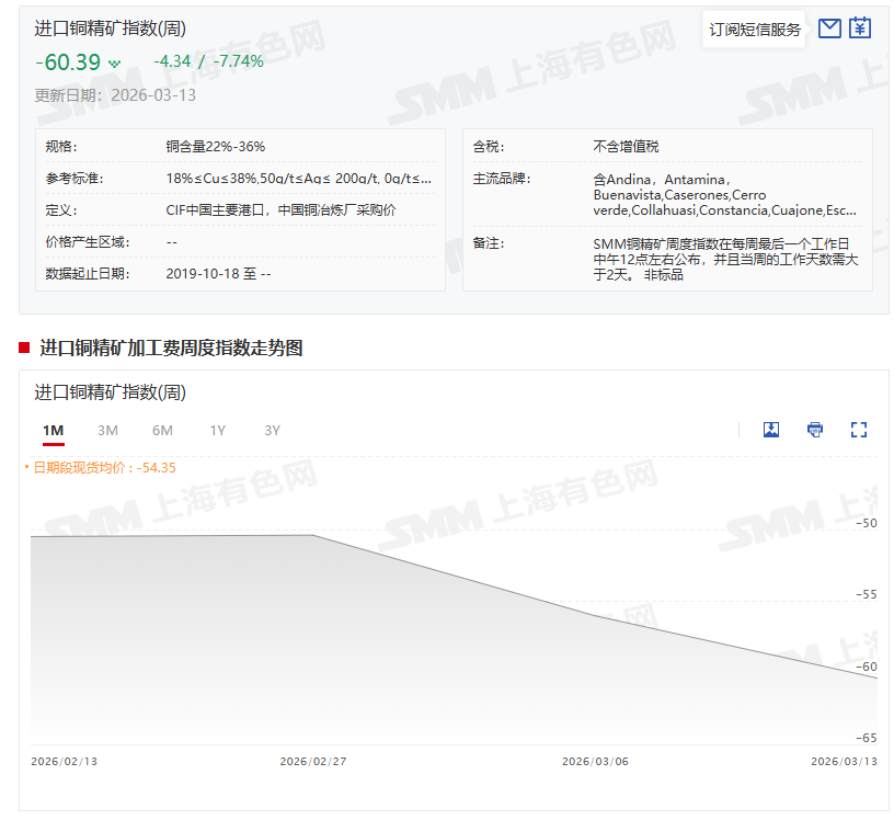 SMM铜精矿指数(周)继续下滑,据SMM数据显示,3月13日SMM进口铜精矿指数(周)报-60.39美元/干吨,较上一期的-56.05美元/干吨减少4.34美元/干吨。