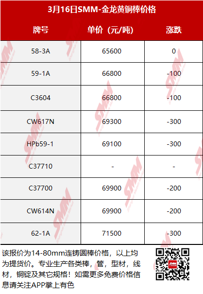【SMM价格】2026年3月16日金龙黄铜棒价格
