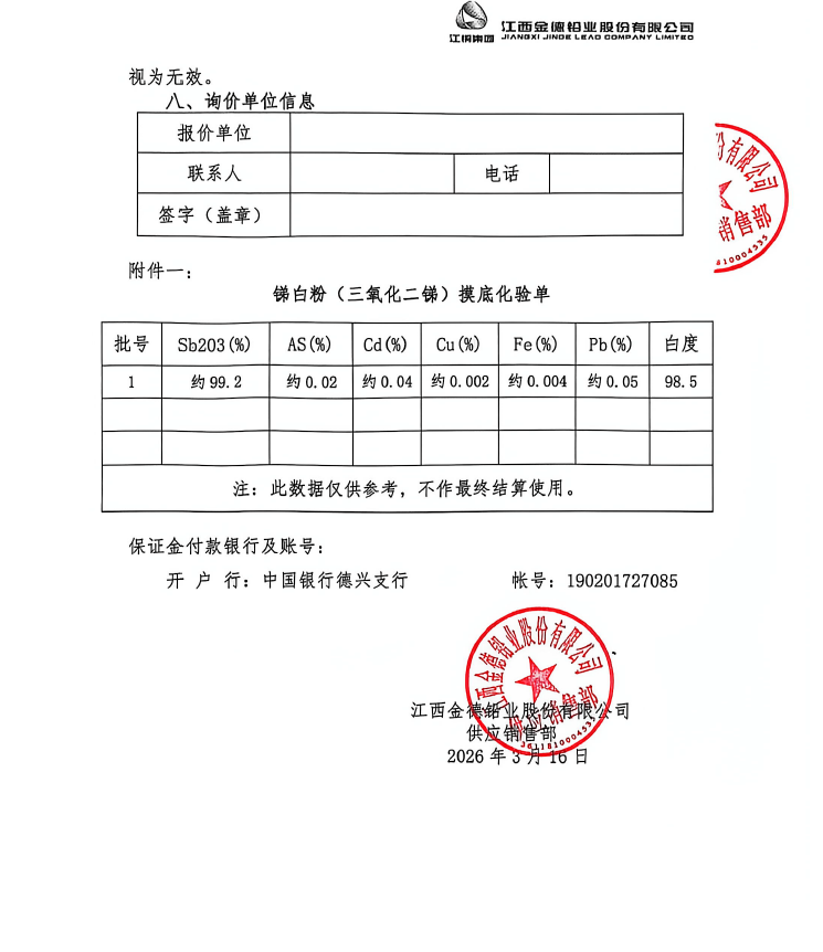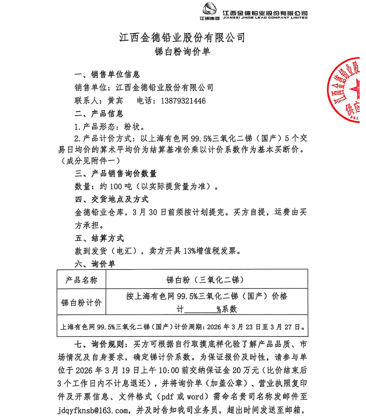 3月16日,江西金德铅业股份有限公司发布江西金德铅业股份有限公司锑白粉询价单,销售数量约100吨(以实际提货量为准)。产品计价方式以上海有色网 99.5%三氧化二锑(国产)5 个交易日均价的算术平均价为结算基准价乘以计价系数作为基本买断价。(成分见附件一)