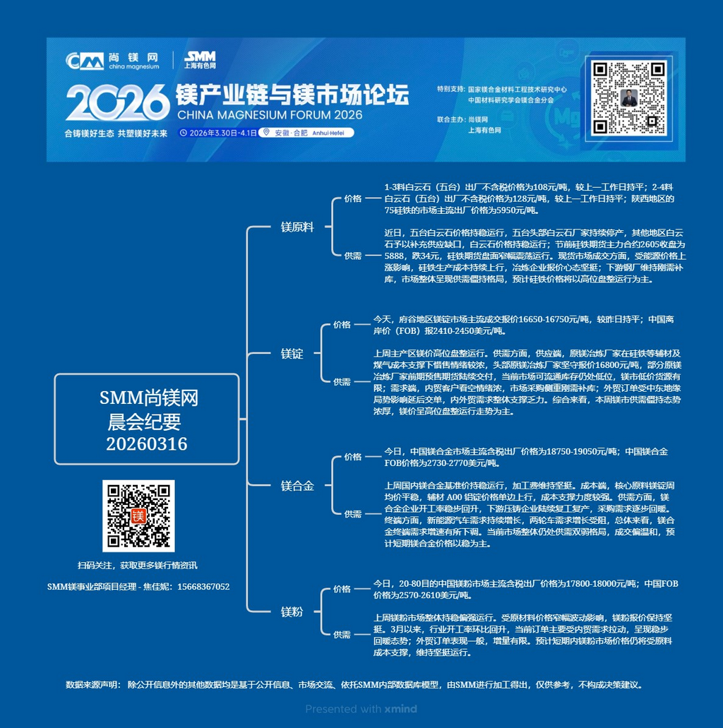 【SMM镁晨会纪要:镁市供需僵持态势升温 镁价弱稳运行】原镁企业开工稳定,部分厂家惜售情绪浓厚,报价坚挺,下游以刚需补库为主。预计短期镁锭价格维持高位盘整走势。
