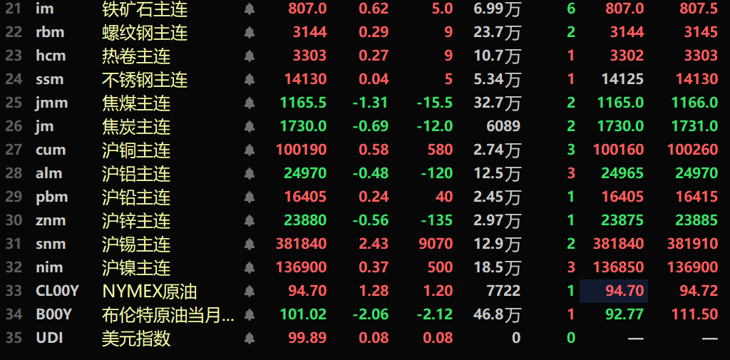 隔夜黑色系多飘红,铁矿涨0.62%,不锈钢微涨0.04%,螺纹钢涨0.29%,热卷涨0.27%。双焦方面:焦煤跌1.31%,焦炭跌0.69%。