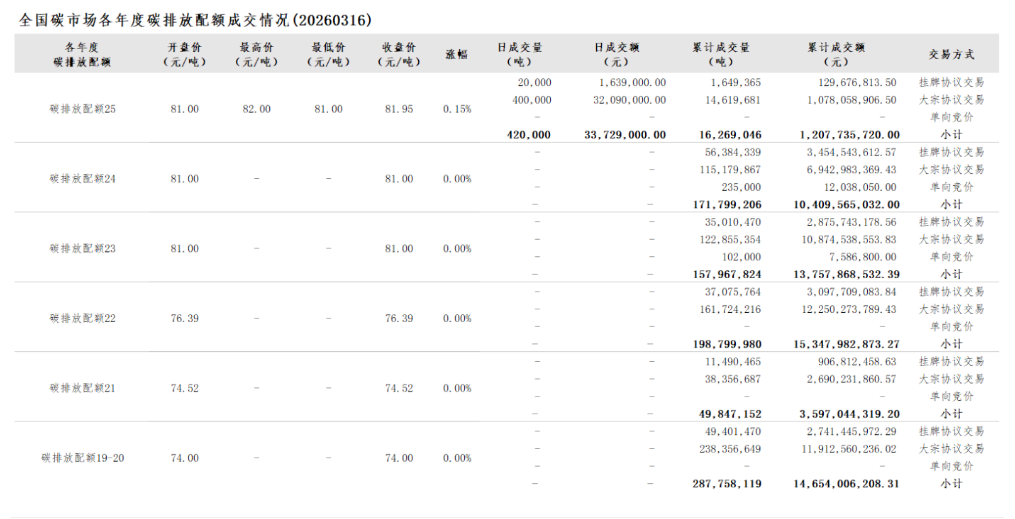 2026年1月1日至3月16日,全国碳市场碳排放配额成交量17,574,807吨,成交额1,311,584,453.60元。